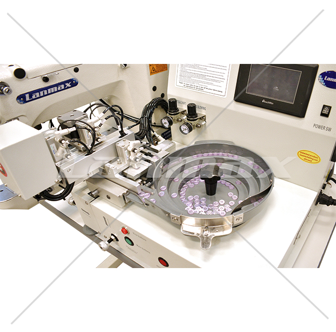 Botoneira eletrônica industrial Lanmax, ponto fixo de alta velocidade de 2700rpm e com alimentador de botão automático. Possui a função automática de levantamento de calcador, corte de linha e limpador fio.