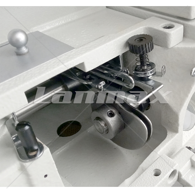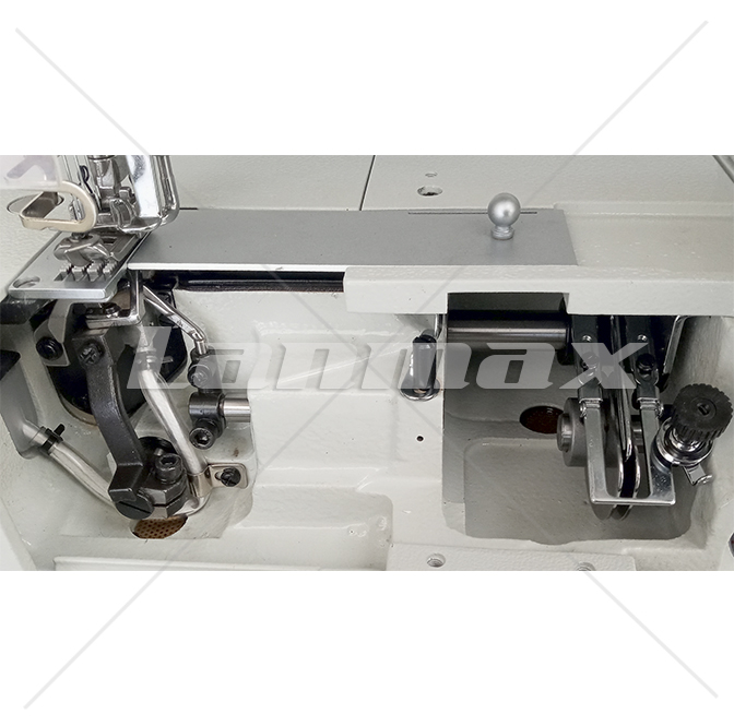 Galoneira de base plana, 03 agulhas e 05 linhas com lubrificação automática e motor servo eletrônico embutido no cabeçote.