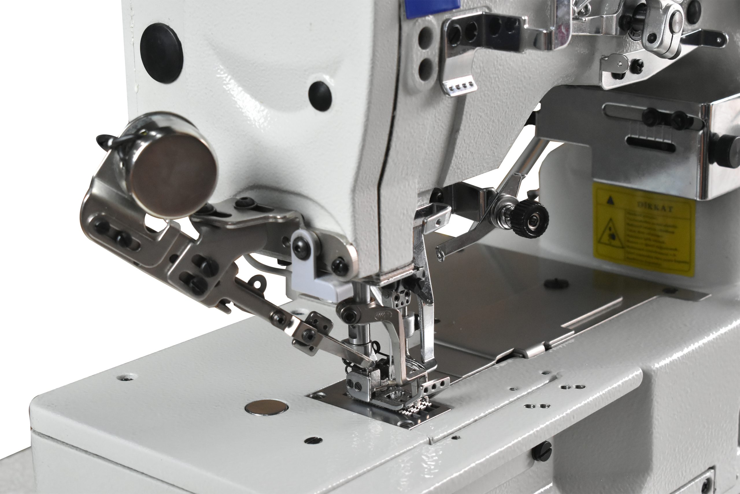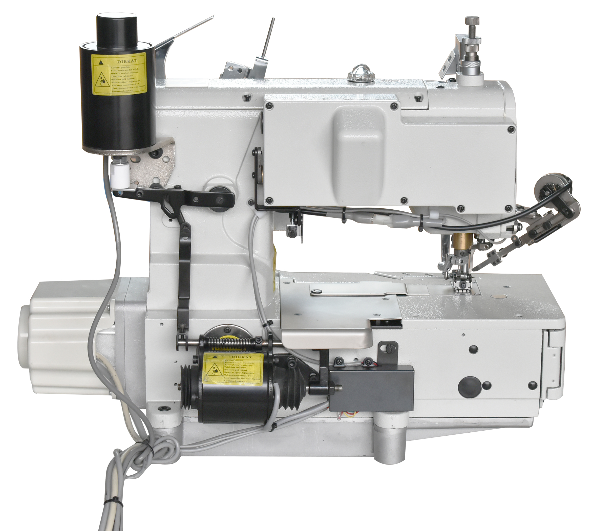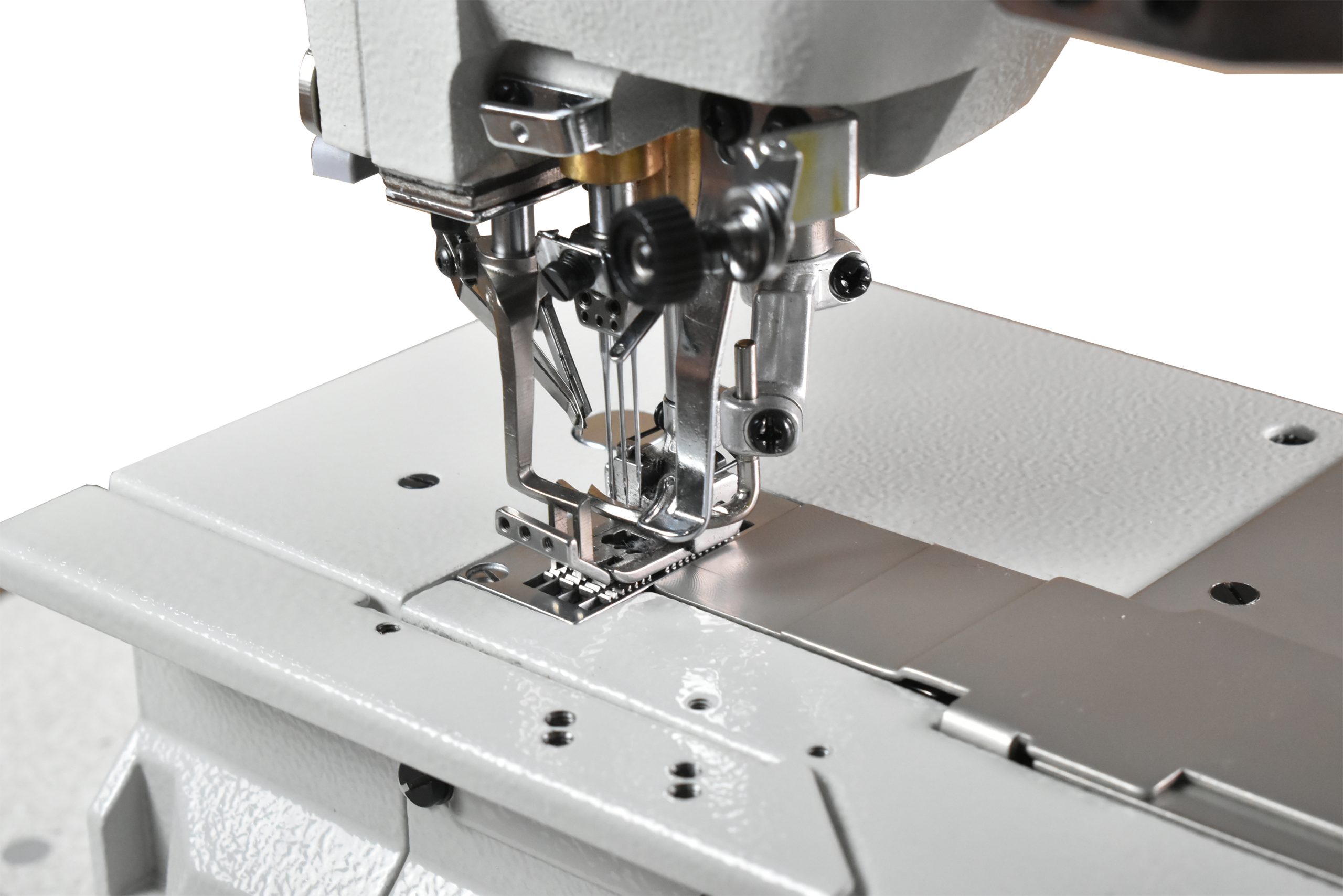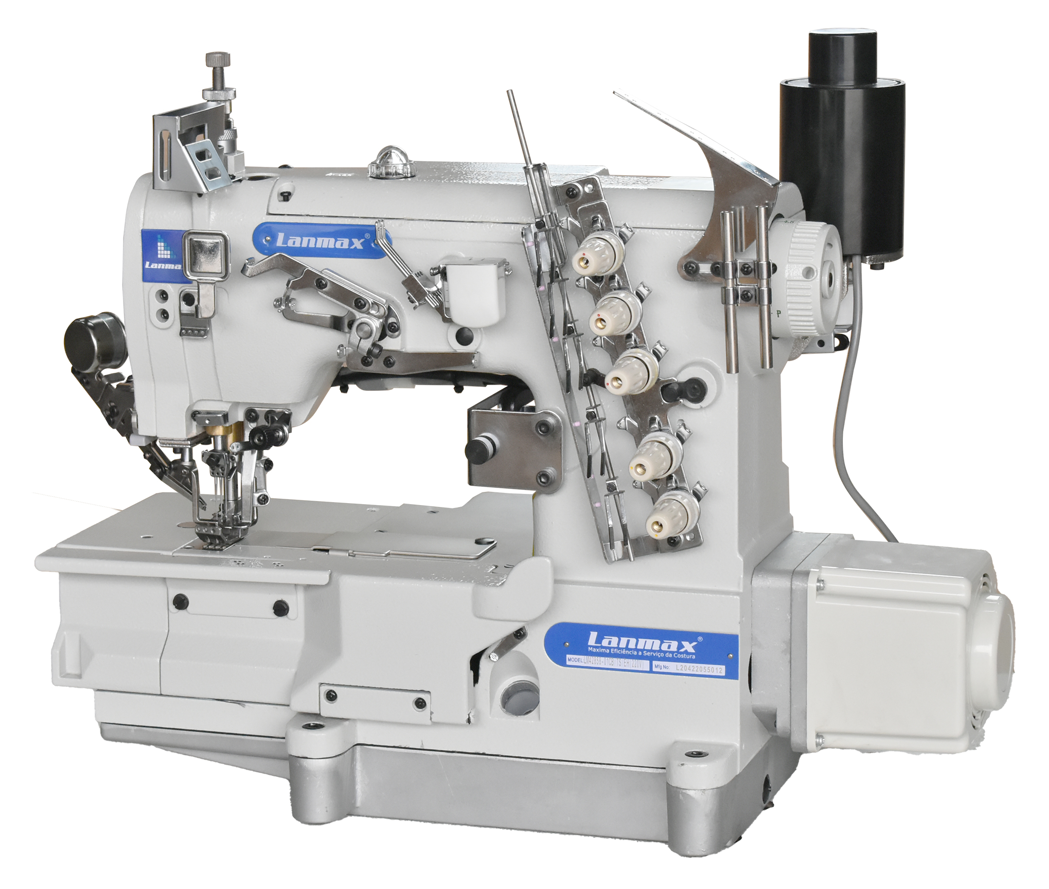 Galoneira de base plana eletrônica com transporte superior e inferior. Base dupla aberta e fechada, 03 agulhas e 05 linhas.