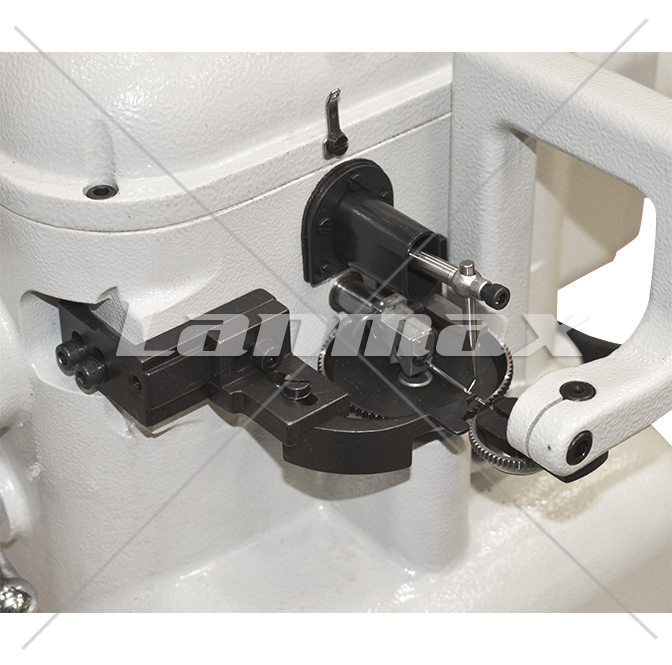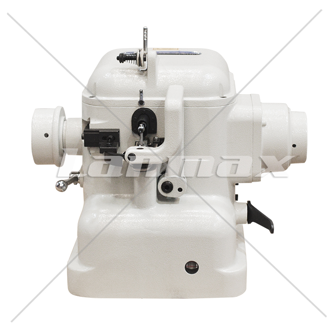 Máquina overloque para couro 1 fio, ponto corrente, motor Direct Drive com controle de velocidade, posicionador de agulha e levantamento de calcador automático por acionamento pneumático.
