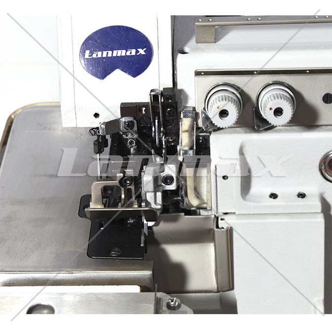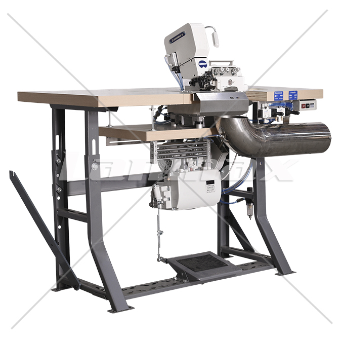 Máquina interloque para tampo de colchão. Possui 2 agulhas e 4 fios transporte superior. É projetada para costurar borda de tampo de colchão na espessura de 80mm comprimido já costurado. Posicionador de agulha em cima e embaixo e ajuste de controle de velocidade de acordo com a espessura do material. Adota uma estrutura síncrona de barra de agulha em um sistema de transporte do material.