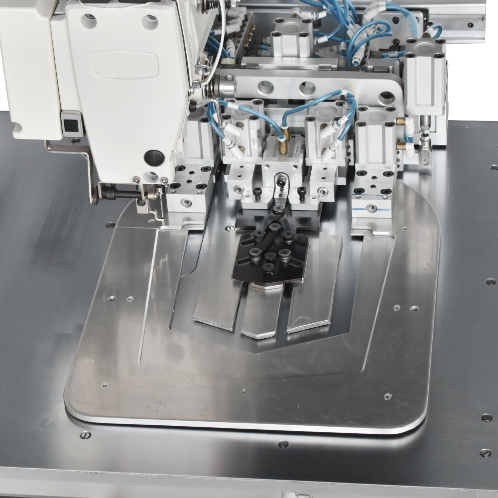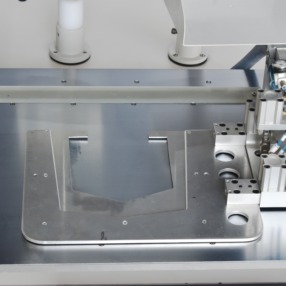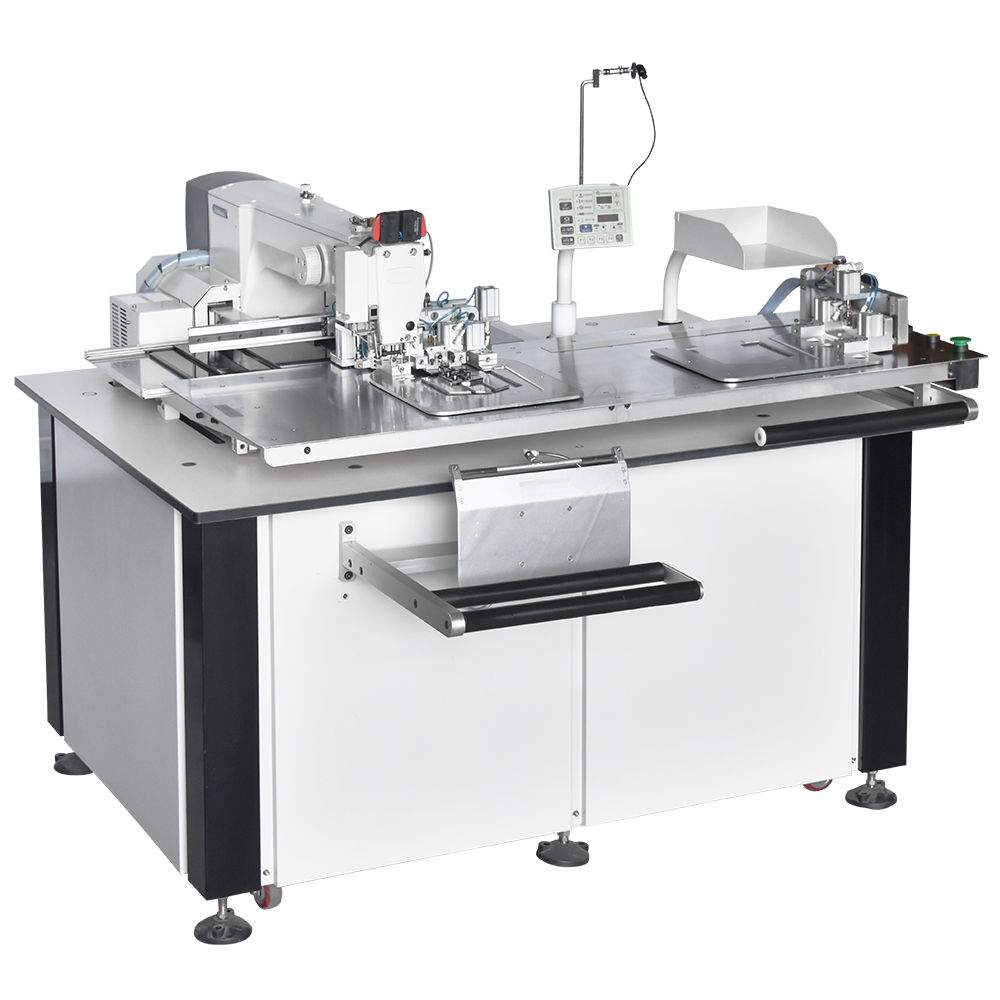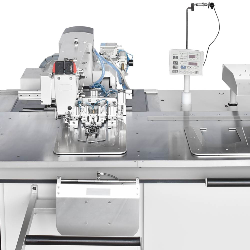 Unidade automática de costura programável com motor Direct Drive e área de 300x200mm. A máquina é utilizada para costurar bolsos dianteiro e traseiro de todas as formas: redondo, quadrado, curvo e assimétrico. Além disso, também pode ser usado para costurar etiquetas de couro, linhas brilhantes de capa de bolso, bolso decorativo, etc. O sistema de lançadeira oscilante permite trabalhar com diferentes espessuras de fio. E ao mudar o modelo de bolso, o bastidor é facilmente substituído através do engate rápido pneumático.